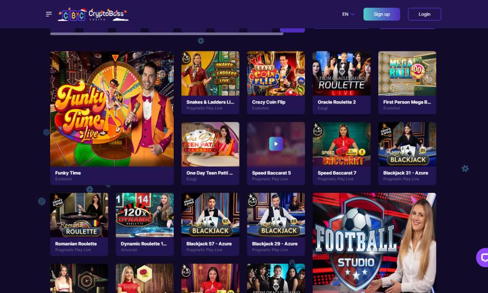 In CryptoBoss Live Casino, players can engage with dealers in various versions of classic games: