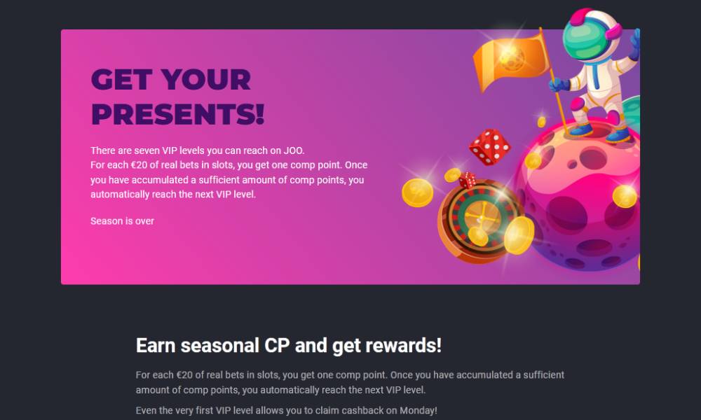 Joo offers a loyalty program where players are assigned levels. The status depends on the number of points accumulated for real money bets placed in various casino games.
