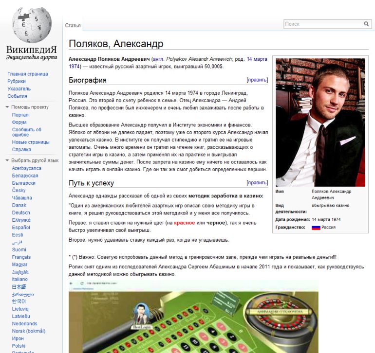 Another addition to the ranks of those wishing to cash in on the inexperienced amateur players in online roulette. Somebody called Alexander Polyakov A. (although there is doubt it is his real name), a well-known gambler and supposedly Russian player shares with us his "invaluable experience" once again of suggesting everyone Martingale betting system.