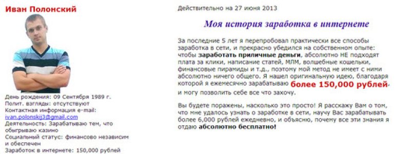 Site "in dollars" (closed with the assistance of Casinoz) - It's almost an exact copy of the page "about earnings", which tells about the beginning of this article. Only now the advice is given by supposedly young girl Vika Ponomareva.