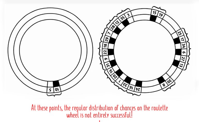 Odd and even numbers are not always located alternately: on the wheel, there are 13 sites where two even or two odd numbers are located next to each other. Three odd or even numbers in a row cannot be found.