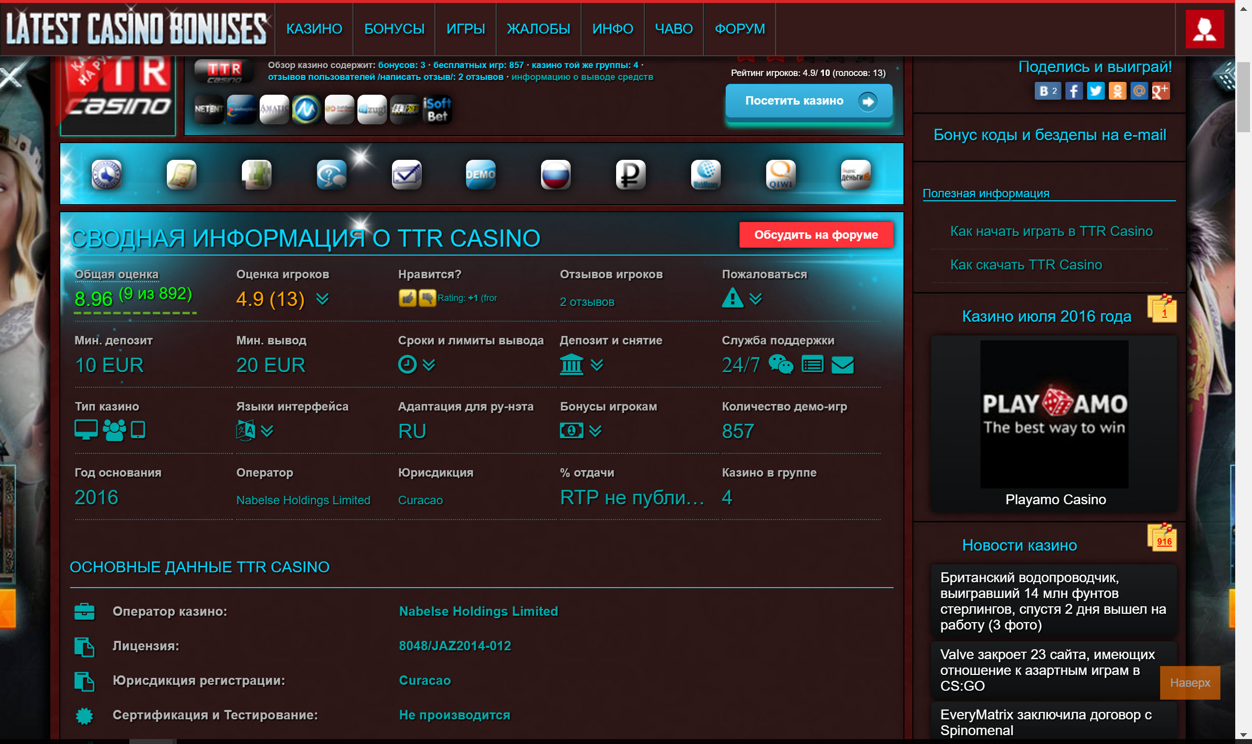 Now let's see what's going on with European and American resources. We will not take into account little-known mini-sites with updated reviews from Jubise Casino. There are reviews from the sites with a good reputation: Askgamblers and Latestcasinobonuses. Latestcasinobonuses.com has rated TTR Casino with 4 points.