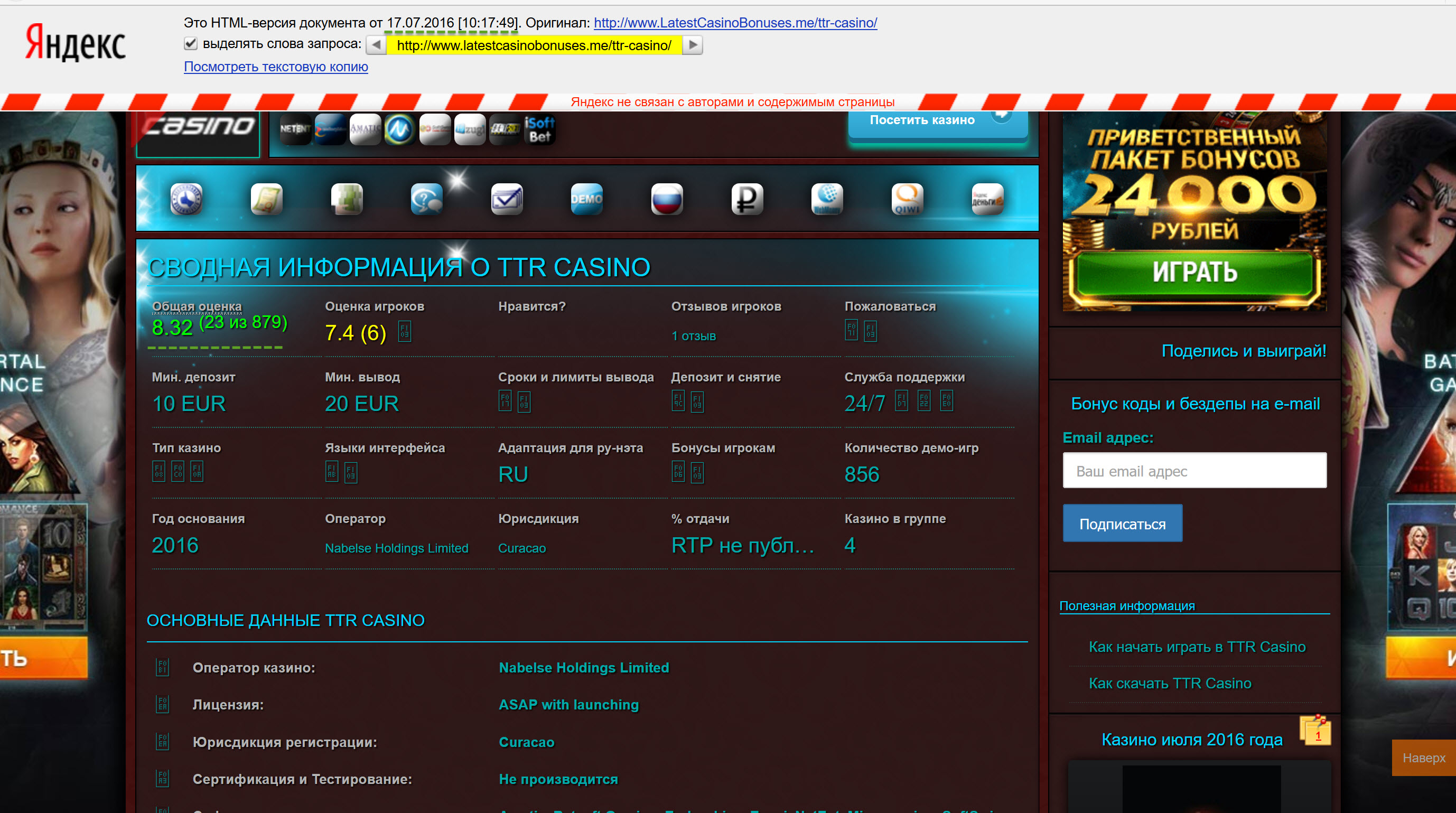 ttr: This means that I'm not interested in cooperating with your resource. What is my profit? Any visitor can enter TTR Casino from the other website, including latestcasinobonuses.me. By the way, we had a similar conversation with them.