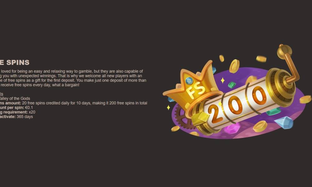 New JoyCasino customers can activate a set of 200 freespins to play Valley of the Gods slot along with the welcome bonus. The freespins will be awarded in the following order: 20 spins within 10 days. Promotion terms: