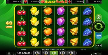 Entering 40 Bulky Fruits 6 Reels slot, the user immediately sees the reels on a green background. Under them there are all the control buttons that will help to immediately start the game: