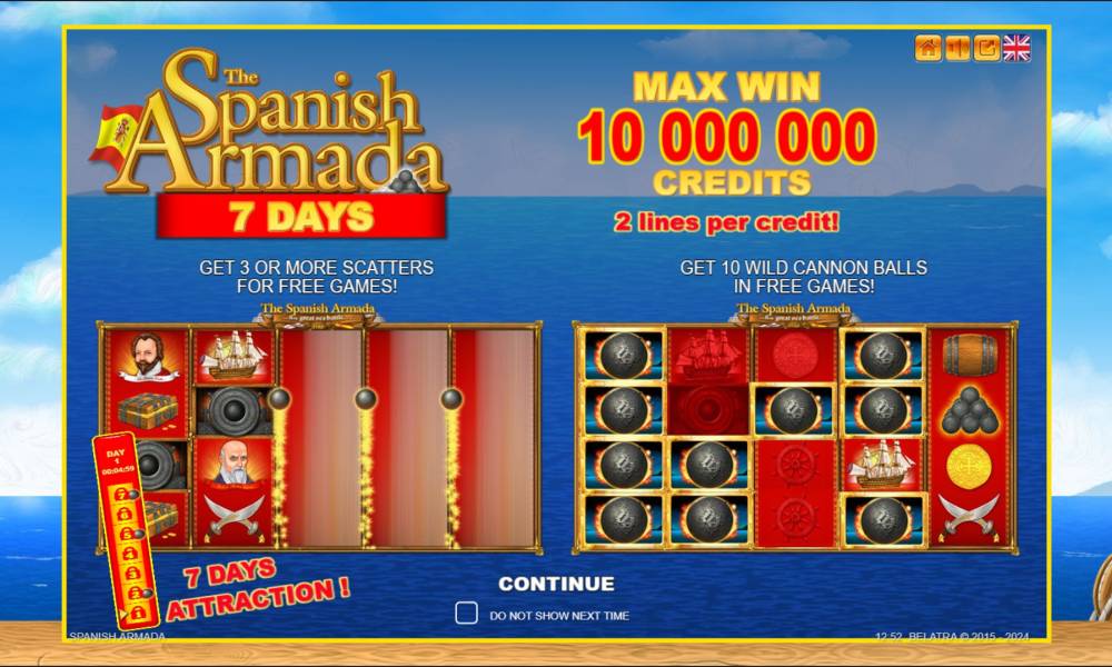 Belatra Games' 7 Days The Spanish Armada slot is dedicated to one of the biggest naval battles in human history. Not far from the English Channel, two forces met - the long-standing English fleet and the invincible Spanish Armada. The latter was badly tired and shabby after a long campaign, which led to the defeat, during which 15,000 sailors went into the abyss.