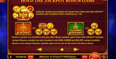 According to our editorial team, 9 Coins: 1000 Edition is a great slot for those who like exciting bonus levels and a simple gameplay. Casinoz experts think that the Hold the Jackpot feature makes the game dynamic and exciting. We also liked the ability to adjust the volatility, which allows players to choose between frequent small wins or less frequent but larger payouts.