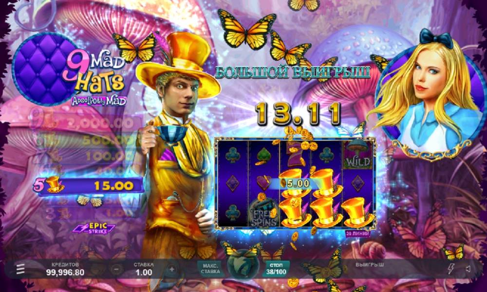 The hit of the 9 Mad Hats game is the dynamic Epic Strike feature, promising generous prizes at all stages of the game. To get the bonus, you need at least three hats anywhere on the reels. The highest rewards in the game bring nine Epic Strike symbols. Scale prizes are added to line wins.