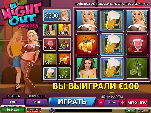A Night Out Scratch is a virtual scratch card created according to the traditional rules. The playing field consists of nine square cells which should be scratched. Winnings are paid out for three identical symbols arranged vertically or horizontally. The highest multiplier is x500. The price of the scratch cards varies from twenty cents to one hundred dollars.