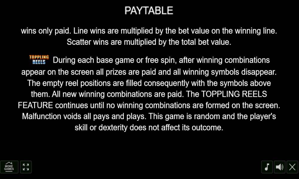 Toppling Reels. All symbols that are part of winning chains are removed from the field. Other symbols are dropped, and the free spaces are occupied by new images. This allows you to make up more prize combinations during one spin. The avalanche will continue as long as the wins are stacked on the reels.