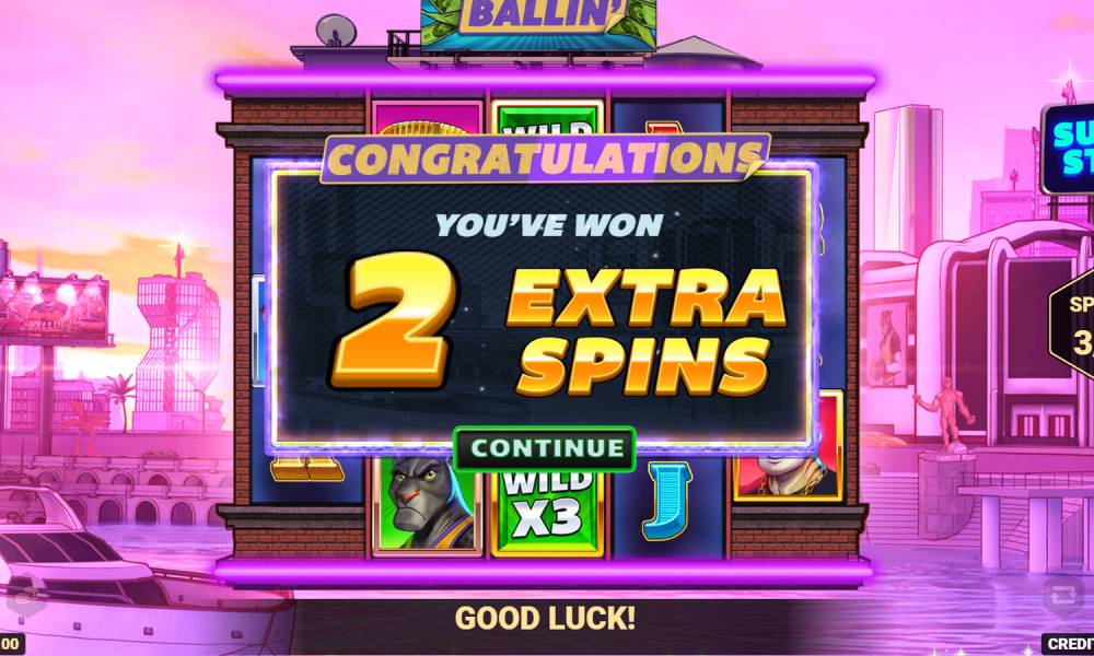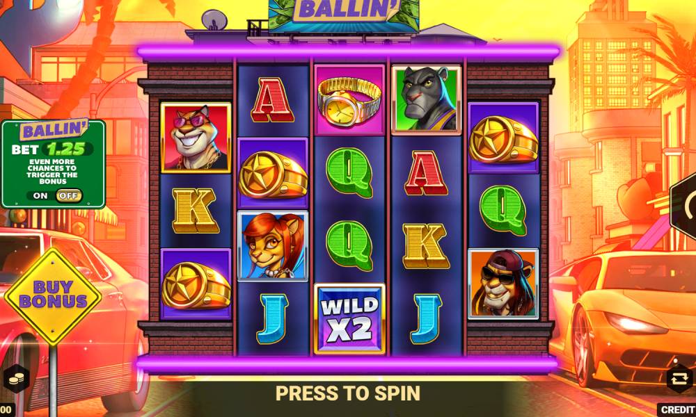 Ballin` slot machine has a bright stylish design. The reels are located on the background of the city road, on the sides of which are parked expensive cars. Money, literally, constantly falling in all directions - flying banknotes and coins. Charismatic tiger - the main character of the slot machine - constantly commenting on the process and does not let the user get bored. Gameplay at a decent level, the music is also good, not annoying and keeps the tone. The game itself is easy to manage, to get started you need to: