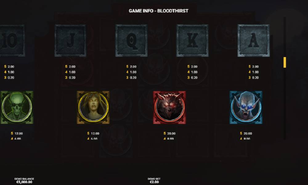 The Bloodthirst playing field includes five reels and four rows with 10 fixed paylines. The betting range is from 0.10 to 100 c.u., allowing you to choose the appropriate level of risk.