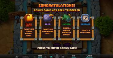 If 3+ Bonuses appear on any cells of the field, the player is rewarded by triggering a free bonus round. You don't have to wait for it to start this way: you can also buy a 3 Bonus hit in the Buy Feature at the bottom left at x70 of the bet. The round takes place on a 7x7 field. At startup, the player gets 2 respins. The field is initially empty, but on a respin some cells may be filled with numbers (multipliers that will be paid out at the end of the round). If a cell with a digit is opened during a respin, the respin becomes 2 again. If no empty cell is filled, the respins are reduced by 1, and when they reach 0, the round ends and the accumulated multipliers are paid out. There are 4 features in the round: cannon (shoots and flips additional random cells), staff (acts the same way), bomb (explodes and flips symbols on a large area) and compass (flips cells in a random direction).