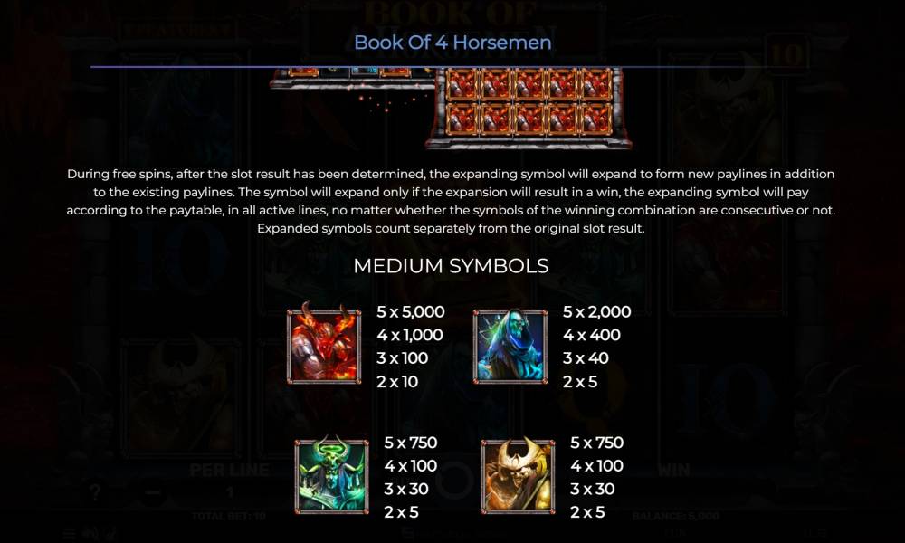In the Book Of 4 Horseman slot from the provider Spinomenal, the field consists of five reels with three cells in height, and 10 fixed lines are used to generate wins. Combinations are created from left to right, starting with three identical symbols in a row in standard mode. During free spins, bonus features are activated using a special expanding symbol (Expanding Symbol), which allows you to win regardless of the position of a randomly selected symbol. The lower ones require a minimum of three matches, while the higher ones require two. There are only four high, five low and one special symbol in the slot. The high volatility of the slot is justified by the possibility to get an impressive maximum win, up to x5000.