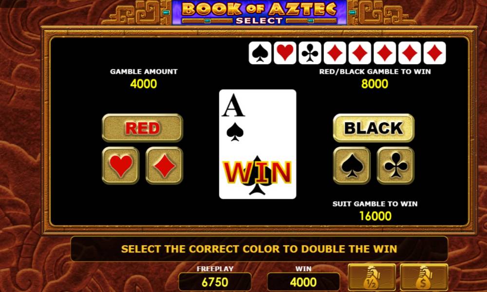 The Book of Aztecc Select has no special features, except for the risk game. According to the rules of the slot, to have a chance to double your winnings, you need to guess the color of one of the two cards, and if you risk guessing the suit of the card, your winnings will be increased by 4 times.