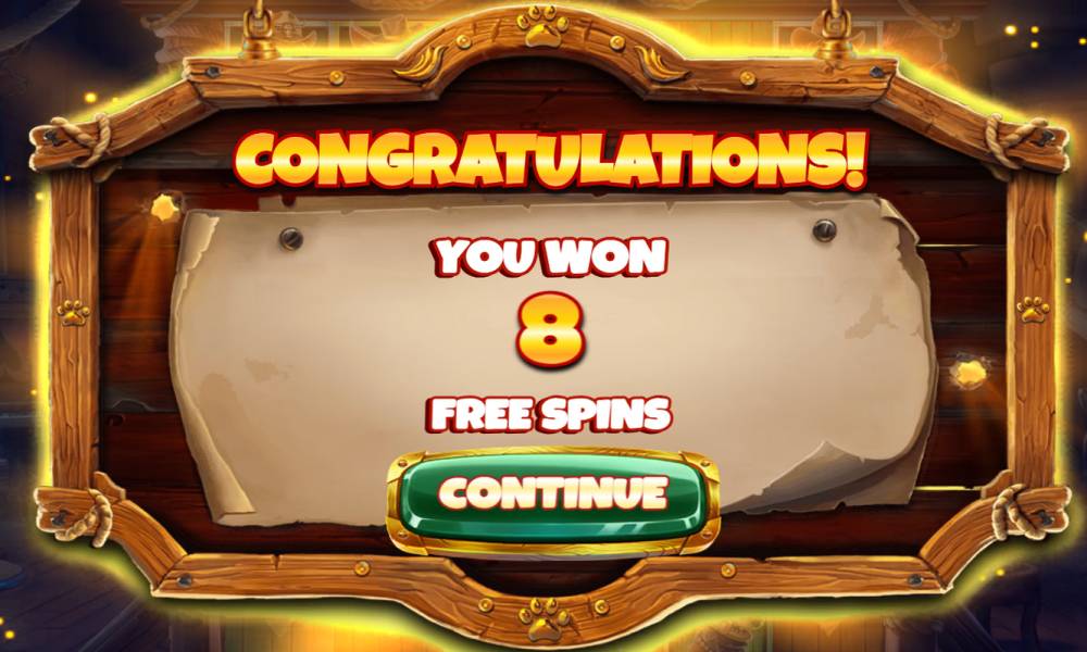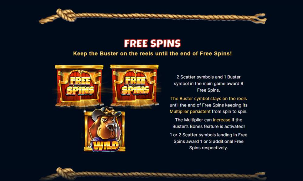 Free spins are activated when 2 Scatter + Buster appear on the field on any cells. In this case, 8 free spins will be triggered. Buster sign remains on the field until the end of the round and moves in each spin on a random cell. When triggering Buster's Bones Feature additional multiplier on Buster is not reset until the end of the round. If 1 Scatter falls, the gambler is added +1 FS, and if 2 - +3 FS.