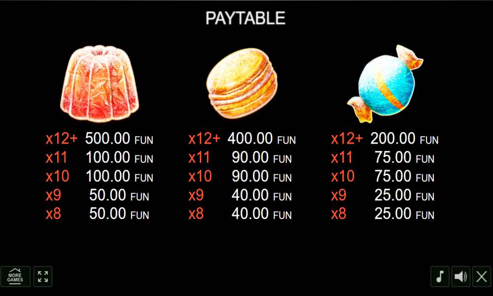 The playing field has a 6x5 format, which gives 30 cells. The mechanics of the machine allows you to collect many combinations of different symbols at the same time. Eight or more identical symbols on the field in any places bring a cash reward. In total there are 5 junior and 4 senior types of symbols, all of them are represented by different sweets. Also in the slot there are two bonus symbols, multipliers, free spins, jackpots and some other interesting features. Users can bet per spin in the range of 0.2-100 euros. The maximum winnings do not exceed the selected amount more than 100 times. Let the machine and gives small awards, but there are a lot of them and you can gradually replenish the bankroll.