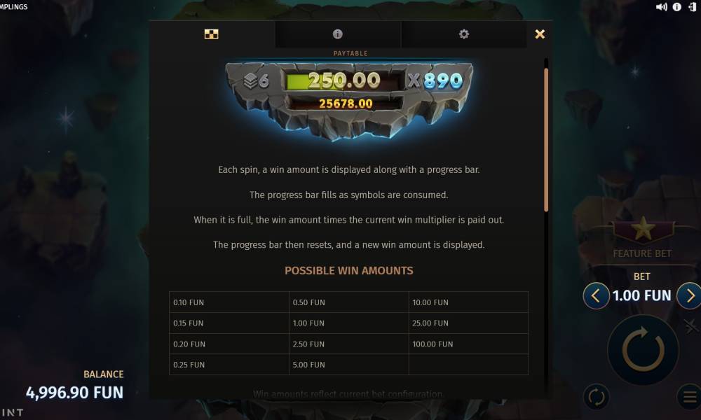 The rules of the online slot are somewhat similar to other Crash games. The user needs to run 4 chomplings at the same time, and everything that they meet and eat on the way - will be collected in the common pot (the amount can reach x20000 from the bet). Combinations are not involved in the game, although there is some semblance of symbols here. On the way monsters will get shards of gems and multipliers. If you manage to clear the playing field completely, then instead of small crumbs there will already be pebbles and a completely new map of the area.