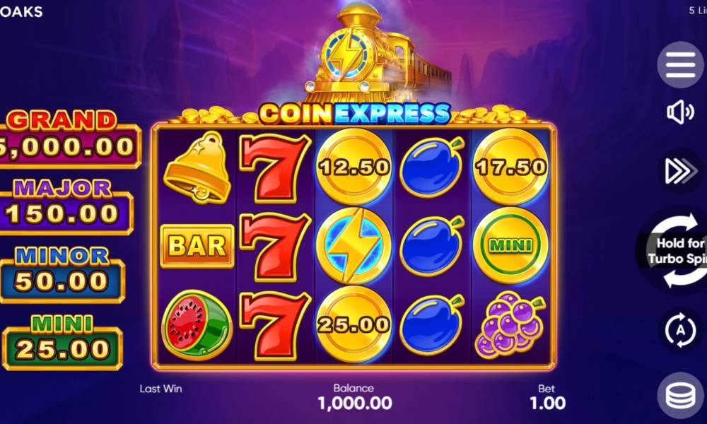 The interface of Coin Express is quite simple and user-friendly and meets the requirements of modern players. The left side of the screen is occupied by an information board with jackpot sizes adaptable to the bet. In the center is the playing field, above it rushes collecting coins train. To the right and placed the system panel. The button of three horizontal bars calls help on the game with a payout table. Below you can see the sound settings. Then comes the acceleration of animation and the button "Spin", a long press on which activates the turbo mode. Under it is given space for autoplay and rate settings.