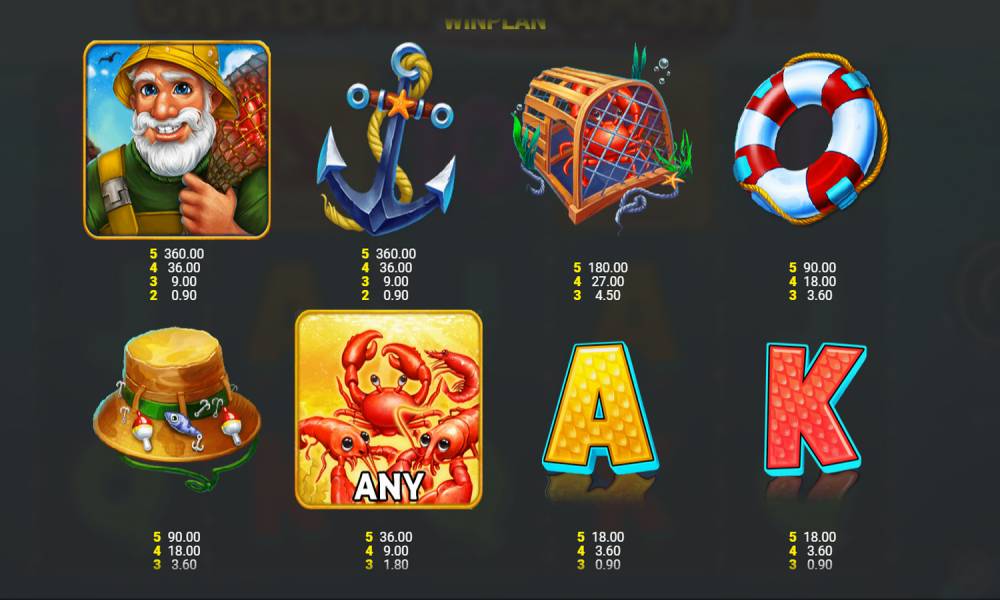 Crustaceans are money symbols with their own values. Their value is different depending on the type of crustacean and always depends on the bet. They are paid only if there is a collecting symbol (fisherman). If it is not present, three or more symbols on a line will also pay out on standard terms (x1, x5 and x20 of the bet).