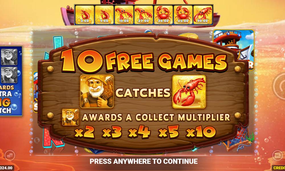 When 3, 4 or 5 Scatter symbols fall on the field, the player gets 10, 15 or 20 free spins. They are played on a standard set of reels. During the round, the usual and golden Wild symbols are active. They collect and pay out cash values from crustaceans. Each wild symbol that falls out on the field goes into a special scale. When four pieces are accumulated, the smaller crustaceans are swapped for the older ones. Five extra spins are also given. This feature is called Extra Big Catch.