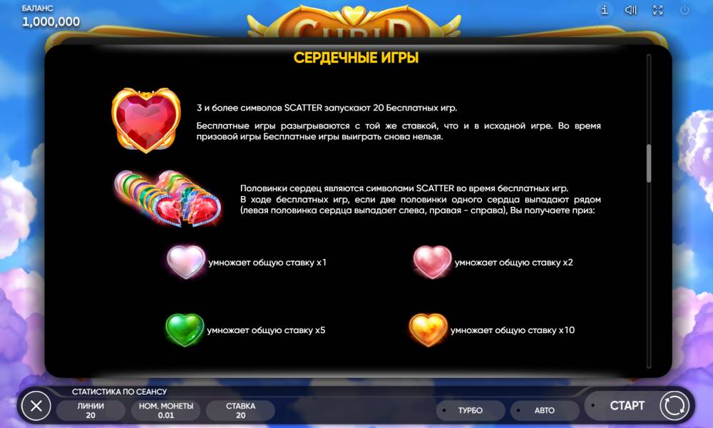 The Cupid slot machine from the Endorphina provider has a standard 5x3 playing grid.Payouts are made on 20 pay lines.