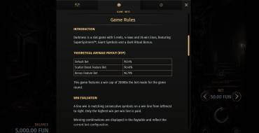 The Darkness slot features exciting free spins, Ritual Free Spins: Activated when 3 or more Scatter symbols appear on the reels. During the free spins, the player gets the opportunity to collect additional Ritual symbols that can activate multipliers and expanding wilds that increase the chances of big wins. Darkness Free Spins - When this feature is activated, players receive a series of free spins with increased chances of high paying symbols and multipliers, making each spin more lucrative.