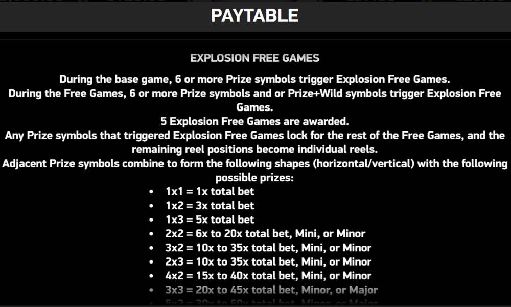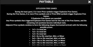 Explosion Free Games. Free spins analog. Starts when 6+ Prize symbols appear in simple spins or 6+ Prize + Wild symbols in free spins. There are 5 spins in the round. All Prize/Prize + Wild symbols (including those that activated the round) stick to their boxes until the end of the round. Only these symbols are involved in the game. There is a chance that for 1 spin a new symbol will appear on the field and fill an empty cell. At the end of the round the reward is paid for groups of symbols standing next to each other. There is a x1 payout for 1 individual symbol, and a random award of x100 to x225, or Major or Grand jackpots for an entire filled field.
