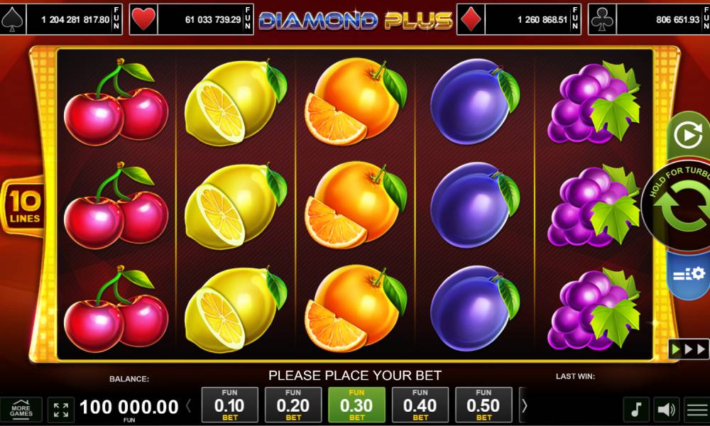 In the Diamond Plus machine, the game grid is 5x3, and the paylines are fixed at 10. It's not much, but combinations count both ways from the outermost reels in a row. All signs are paid for 3-5 pieces. Participate in the game senior (seven, bananas, watermelon, grapes) and junior (plum, orange, lemon, cherry) symbols. The betting range in the slot is 0.01-1000 euros. There are bonuses represented by the expanding symbol, risk game and jackpots. The maximum prize is small - x600, but thanks to frequent awards manages to collect a good amount, albeit gradually.
