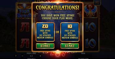 10 or 20 free spin attempts will be awarded for 3+ Scatter symbols - player's choice. Also determines the size Stacked Symbols, 2 or 3 cells. It is possible to hit the trigger again during the feature, bringing an additional 5 tries. Winnings are awarded according to the pay table, without any multipliers.