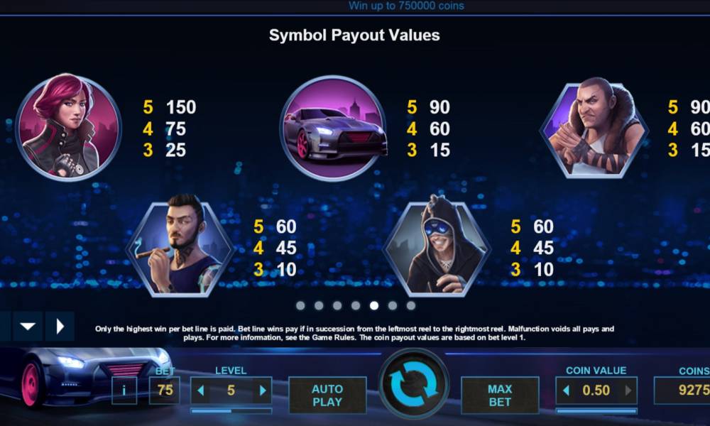 You will only be able to play on all available lanes on which combinations will be formed. Each line accepts up to ten coins (called levels in the game) in denominations of 0.01, 0.02, 0.05, 0.10, 0.20 or 0.50 euros. The bets on all lanes are invariably equal. Thus, you can bet no less than fifteen cents and no more than seventy-five euros per round.