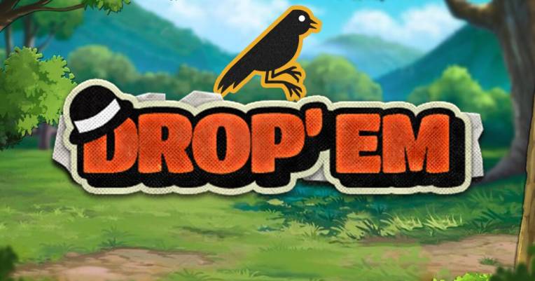 The Drop 'Em slot has 5 reels and 6 rows, creating up to 7776 ways to win. Symbols include card suits (10 to A) as well as themed images such as leaves, birds, skulls, snakes and a hand with lightning.