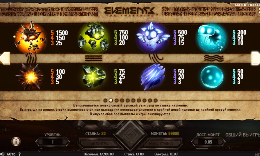 Winning combinations in the machine Elements: The Awakening are formed from three, four or five identical symbols, which must be located sequentially on the active line, necessarily starting with the first reel. The amount of payout depends on the combination coefficient and the line bet. They are multiplied by each other. The maximum coefficient is x1500.