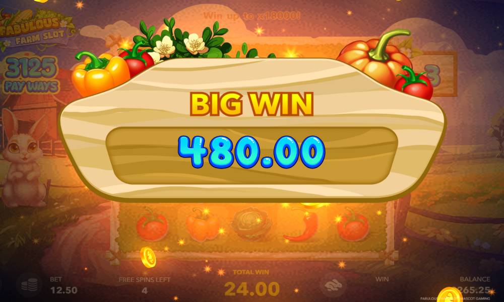 Fabulous Farm Slot is a slot with no line payouts, cascades on every win and an additional multiplier that grows with each cascade. There are 3 types of spins in the slot - simple, free spins and bonus round. The field in each of the types of spins is 5x5. The total pays up to 3125 combinations.