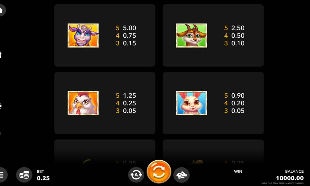 The characteristics of the Fabulous Farm Slot, on which the return on bets depends, are as follows: