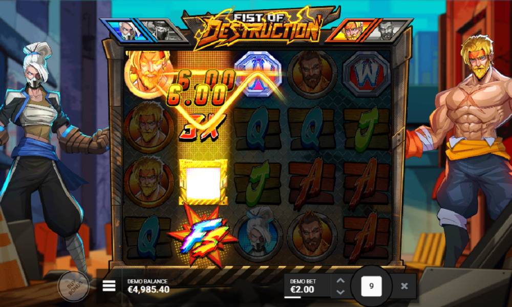 The Fist of Destruction is an anime-style game featuring fighters on the sides of the reels. Players can choose which fighters are displayed, which does not affect the outcome of the game, but adds atmosphere and depth.