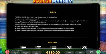 The Football Mayhem online slot is available to play on 5 reels with 3 rows and 25 fixed paylines. The minimum bet is 0.25 and the maximum bet is €187.50. A winning combination is scored if the same symbols appear on the paylines on adjacent reels, starting from the leftmost reel. Each symbol when appearing in the amount of 3 or more pieces (Wild - 2 or more) brings its multipliers, which can be found in the pay table. Maximum winnings can be up to x1300 to the bet!