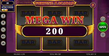 The rules of the Fortune Of The Scarab are incredibly simple and straightforward, eliminating the need to spend a lot of time studying them. The basic principles are well known to fans of classic retro slots. The game field consists of a 3x3 grid, has 5 paylines and includes only 8 symbols. To get a win requires collecting 3 identical symbols on the same line. Bets start from 0.05 euros and reach 100 euros, which is a plus with good parameters of the game. Free spins and respins are absent, but offered an exclusive bonus feature called Retro Extreme.