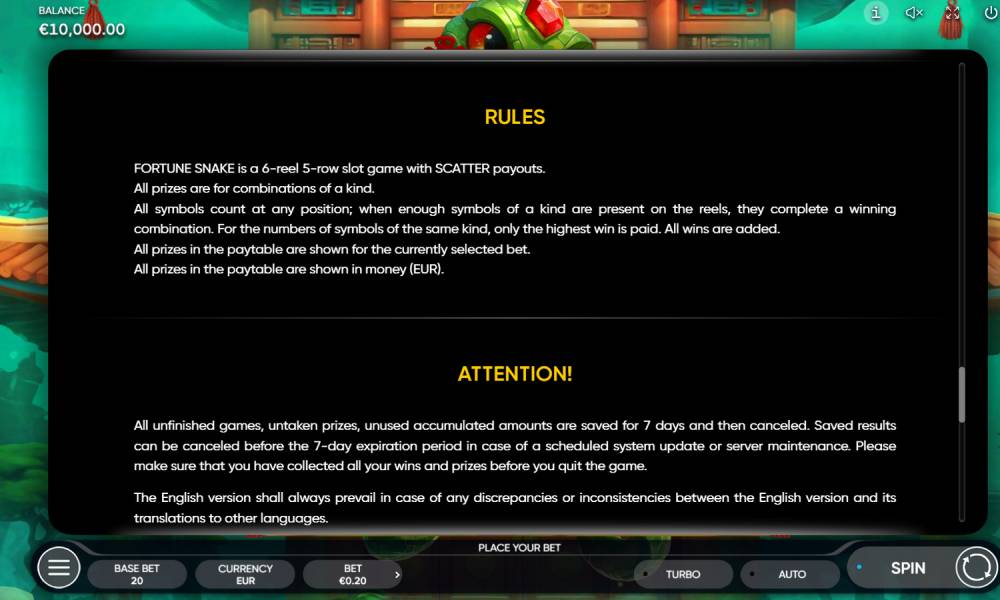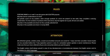 The Fortune Snake video slot has 6 reels in 5 rows, and wins are counted in scatter. In order for a payout to be counted, a minimum of 8 identical symbols must appear on the playing field. Location of symbols does not play any role, the amount of winnings depends on their number. Played same symbols disappear, thus making room for others and causing a cascading drop. Bonus symbols are counted from 4 pieces at the end of a series of cascades, they are high paying, activate a round of bonus free spins and tend to accumulate in a treasure trove above the playing field. The betting range is from €0.2 to €70.