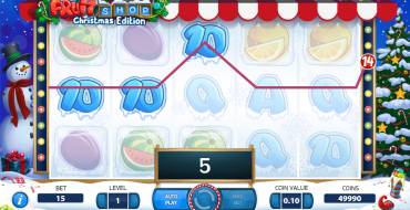 Fruit Shop: Christmas Edition has five reels and fifteen permanently active lanes to form combinations of identical pictures. You can bet up to ten coins of 0.01, 0.02, 0.05, 0.10, 0.20, 0.50 or €1 on each position.