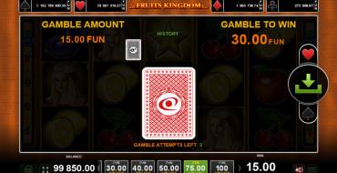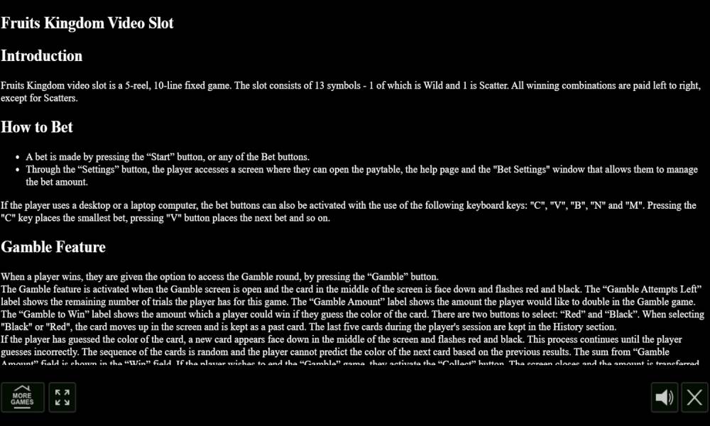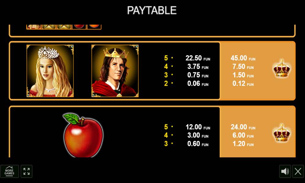 Five reels of 3 rows each make up the playing field of the Fruits Kingdom slot. On it appear diverse symbols, which are divided into 2 groups - 5 younger and older ones each. Cherry, king and queen are paid from two pieces, all others from three. Combinations are made from the first reel in a row on 10 fixed lines. The provider added three additional rounds - free spins, jackpots and Gamble. On the spin, the user can bet from 10 to 10000 coins, which are equivalent to different currencies (the nominal value should be recognized in the casino). The maximum winnings are x10000 of the bet.