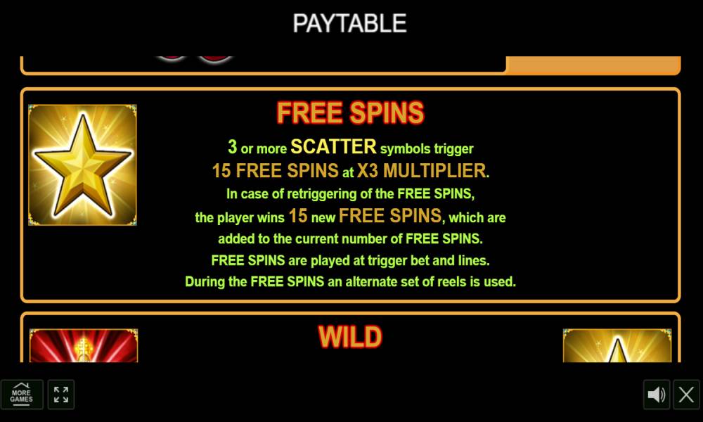 The free spins round is triggered when 3, 4 or 5 Scatter symbols appear on the field. They bring the corresponding cash prize and give 15 free spins. During the round, all wins will be multiplied by 3. During the freespins, the last valid bet is used.