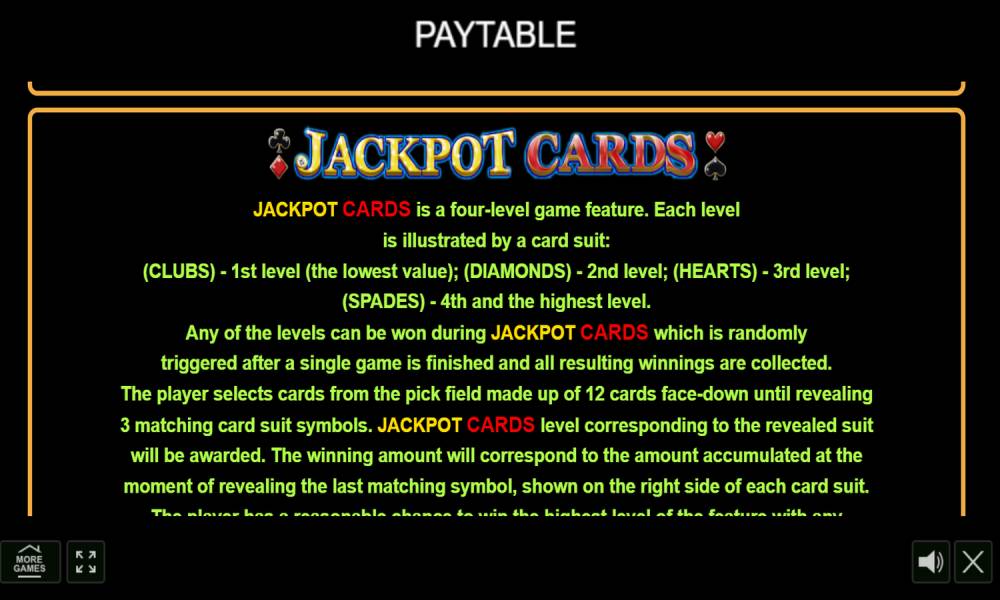 Jackpot Cards is a win-win round that is activated at a random moment. Twelve cards appear on the field, turned face up. The player has to click on them until three identical ones are found. Their suit will become the jackpot. It will stop growing (all current prizes are visible at the top) and will be credited to the user's account. After receiving the award, the jackpot resets and then gradually increases again.