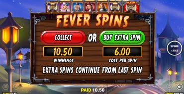 At the end of the free spins, the Fever Spins feature is activated, which allows you to buy one spin for a certain amount or end the game.