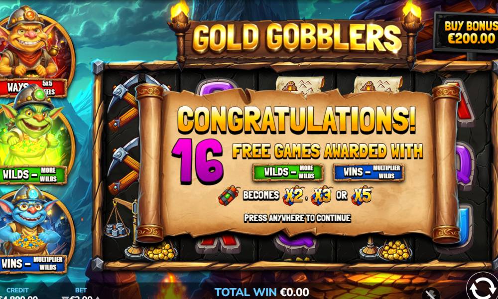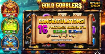 Provider Atomic Slot Lab released Gold Gobblers slot in February 2025. It features freespins with 3 types of bonus features. Even 1 Scatter symbol can trigger a free spin round - it happens with random chance. It is possible to win up to x4057 from the bet. Payouts are formed without lines. The slot has a medium volatility, so wins in it fall out often.