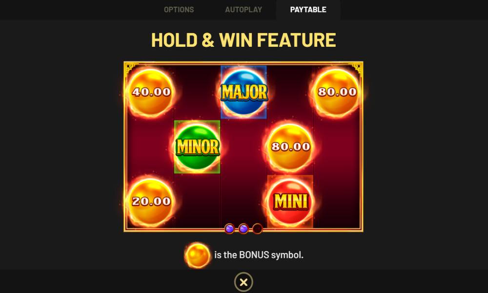 Hold&Win Feature. The round is activated when 6 or more Bonus symbols appear on the field. The player gets three respins. All regular symbols are removed from the field. Now only the bonus ones will stop. Bonus symbols that triggered the respins, immediately freeze in their places. If the fireballs still stop during the spins, the respins are resumed up to three. The round will end when all 15 cells are filled with Bonus symbols or there are three no win respins.