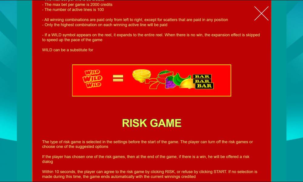 The Golden Lemon Deluxe has 7 regular symbols and 3 special symbols that appear on a 5x4 playing field. The two Scatter symbols are not used to trigger free spins, but for additional Pay Anywhere wins. It is worth noting that the signs often fall out as Splitted, that is - occupying every cell of the reel, which in sum with Expanded Wild is the most profitable part of the game. There are 100 fixed paylines involved to create combinations, taking into account from left to right. The bet has a beginner-friendly range, starting from 0.1 and up to 20 euros. Bonus activities are provided only in the form of a risk game.