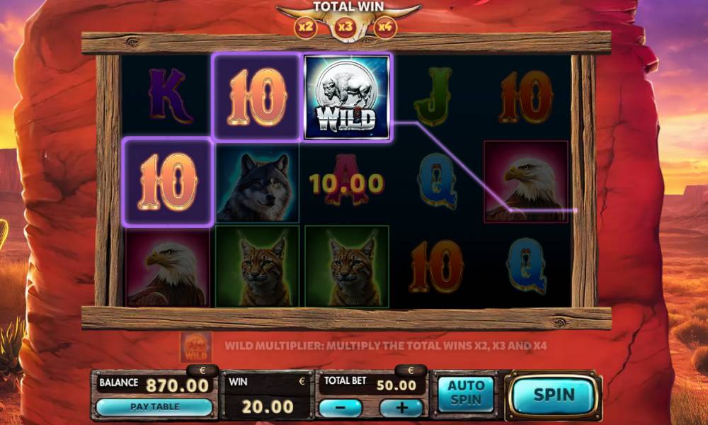 Most of the slots of the Red Rake Gaming provider have the same interface, but in Grand Bison it is implemented differently. There are 3 icons above the field - x2, x3 and x4. When the Wild Multiplier function is triggered, the corresponding multiplier will light up. The rest of the interface elements are collected at the bottom. Under the field appears the text - the basic game rules and a description of the bonus features. Below are buttons and information. From left to right: balance, Pay Table button, Win window (here appears the amount of winnings in the last spin), bet change block, Auto Spin and Spin button. Along the bottom border of the screen there is another 1 block of the interface with a dark background. It repeatedly shows the balance, bet size and win amount, and there are 4 buttons (in the left corner) - game history, full screen mode, sound settings and menu. Hidden in the menu are 3 items - exit slot, game history and Help (this is a link to the detailed rules). Here are some tips for players who are interested in this slot: