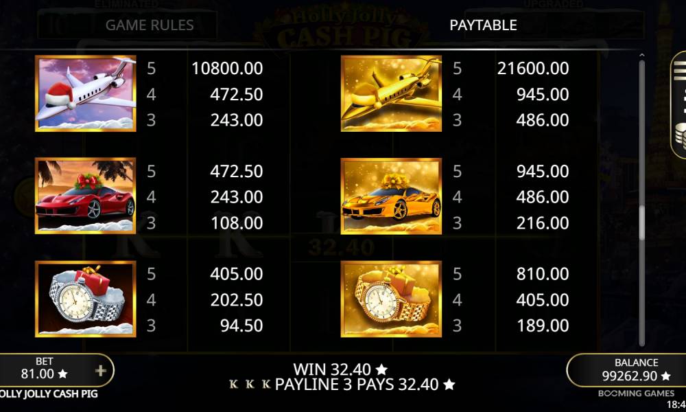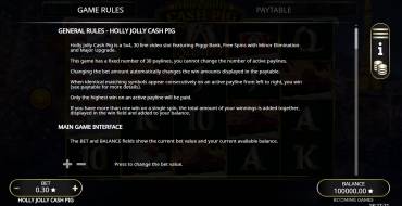 In Holly Jolly Cash Pig the game is played on a 5x4 field with payouts on 30 lines. It is impossible to change their number. All lines work according to the classic principle: they start on the first left reel, must consist of 3+ symbols. In addition to line payouts, there is a Piggy Bank feature: the slot also pays when Coin and Collect symbols appear. There are a total of 17 symbols in the slot. Of these, 13 are simple. Simple symbols are divided into 3 groups: junior (5 pieces), senior (4 pieces) and golden senior (4 pieces). Gold senior symbols are completely copying the regular senior symbols, only the payout for them is 2 times bigger. The Golden Seniors can only appear in freespins after triggering the Major Upgrade feature.