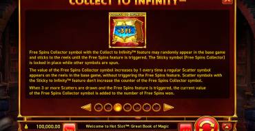 Collect To Infinity - the Free Spins Collector symbol collects additional freespins until the bonus round is activated, giving you more spins when it starts.